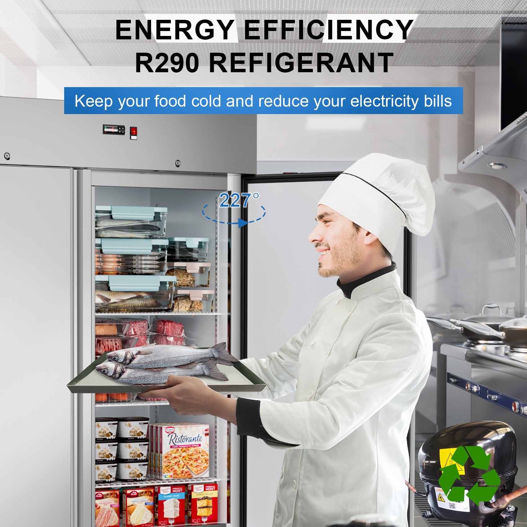 Our commercial freezer utilizes the environmentally friendly R290 refrigerant and a high-efficient compressor for superior cooling performance. It also features a energy-efficient LED lighting, and 49 Cu.ft. storage capacity with 6 shelves. The powerful refrigeration system with a high-performance compressor and fan cooling ensures uniform cooling and freshness of stored food.
