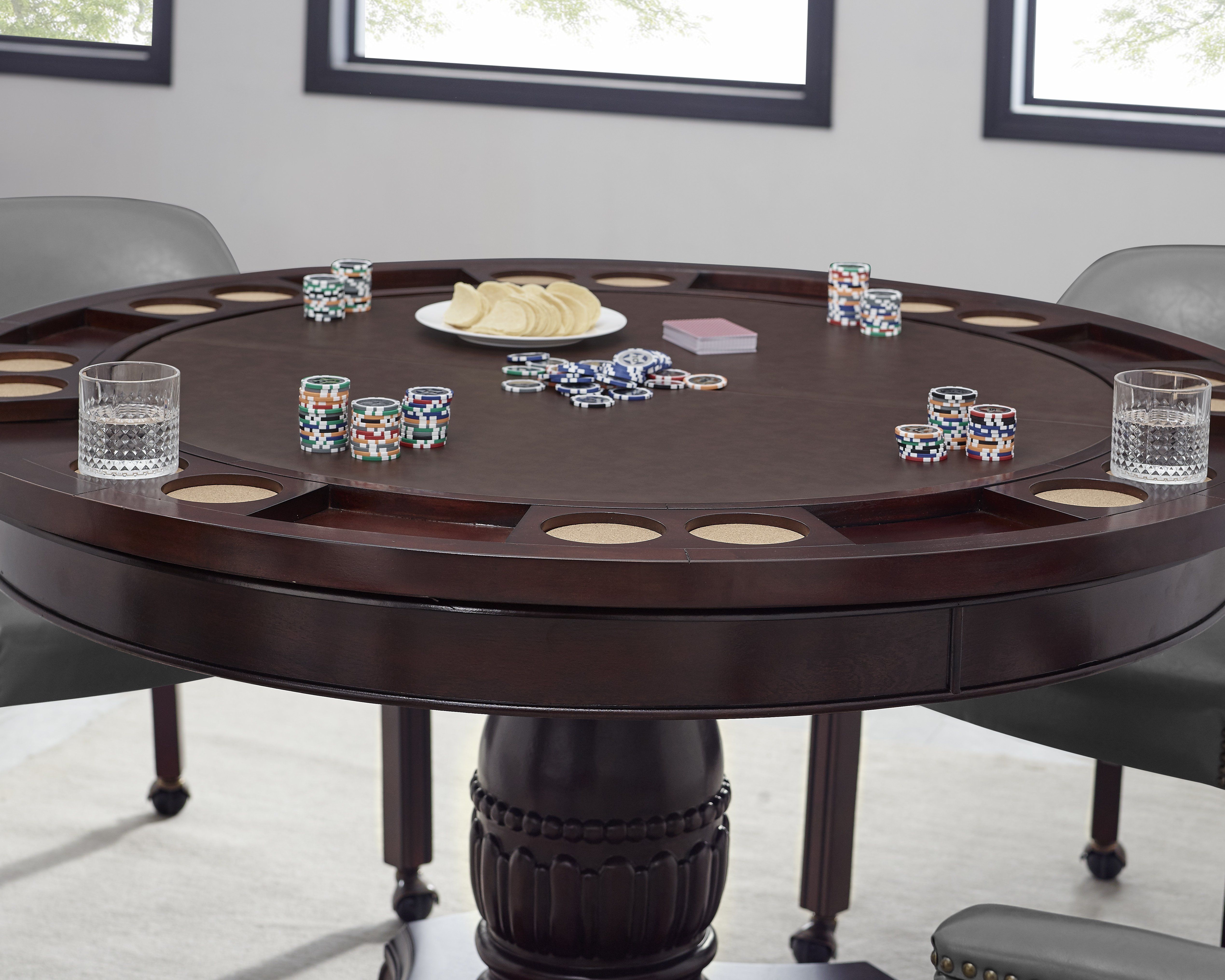 Each piece also sold separately: 48-inch Round Dining Table, Brown Game Table Top, and Gray Leatherette Captains Chairs
